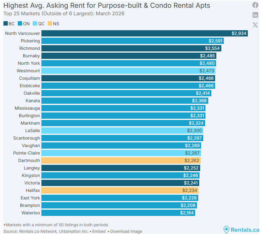 在大西洋地区,达特茅斯(Dartmouth)(2,262加元)由于新建物业占比较高,成为最昂贵市场;哈利法克斯(Halifax)(2,234加元)排名略有下滑,低于金斯顿(Kingston)(2,246加元)和维多利亚(Victoria)(2,241加元)。