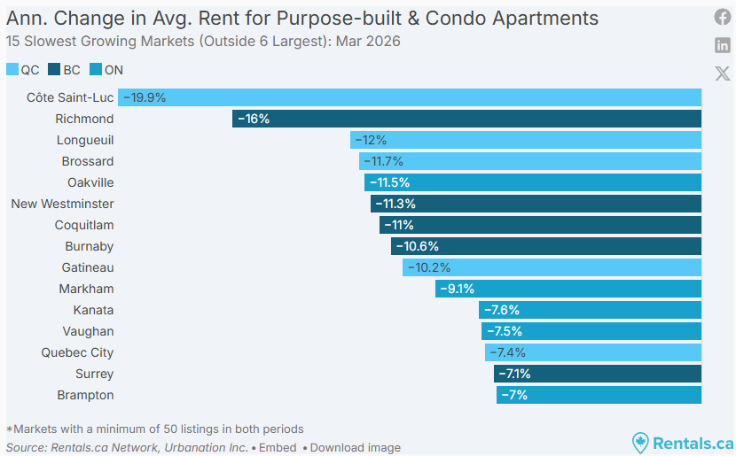 在加拿大最大租赁市场周边的次级城市,公寓租金出现明显下滑,多个城市跌幅达到两位数,包括:科特圣吕克(Côte Saint-Luc)(-19.9%)、列治文(Richmond)(-16.0%)、隆格伊(Longueuil)(-12.0%)、布罗萨德(Brossard)(-11.7%)、奥克维尔(Oakville)(-11.5%)、新西敏(New Westminster)(-11.3%)、高贵林(Coquitlam)(-11.0%)、本拿比(Burnaby)(-10.6%)以及加蒂诺(Gatineau)(-10.2%)。