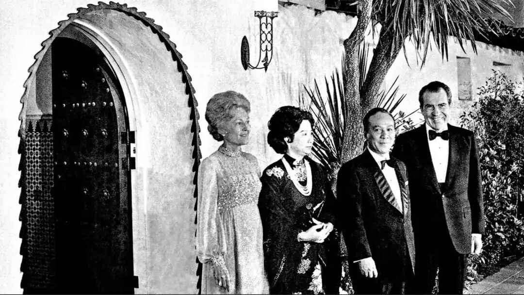1973年,尼克松与南越总统阮文绍及其夫人阮氏梅英在前门附近合影。